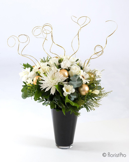 A hand tied bouquet full of white and gold splender. An ideal addition to any room at christmas - these will come in festive tin jugs or festive tin vase (black glass vases no longer available)
