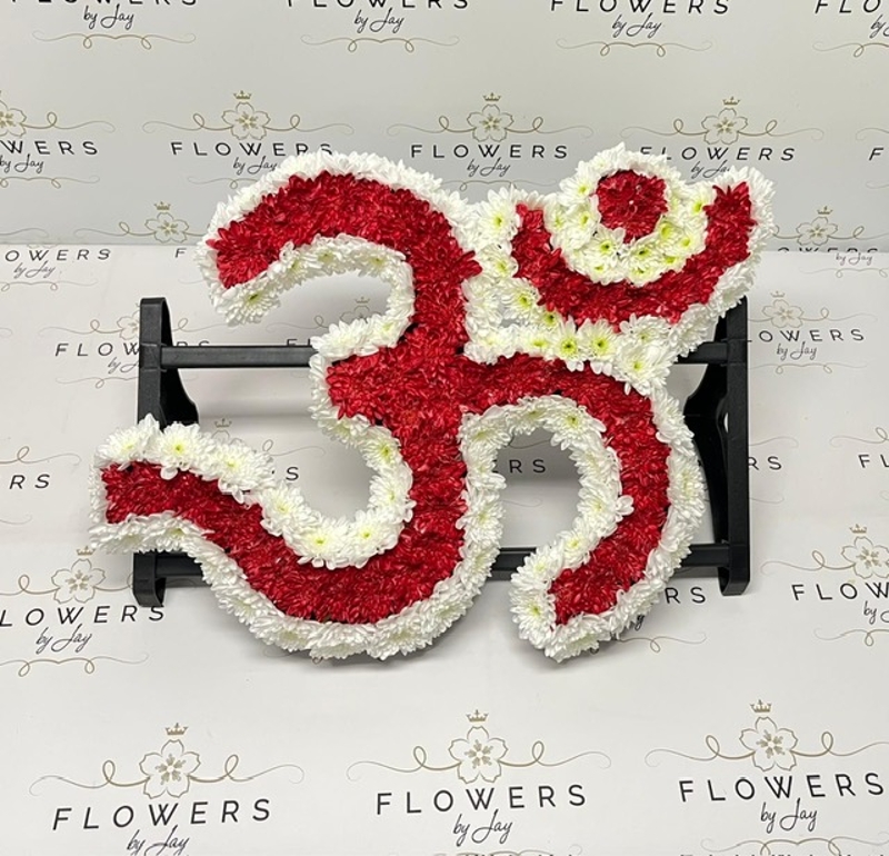 White based OM with a top base layer of red chrysanthemums.