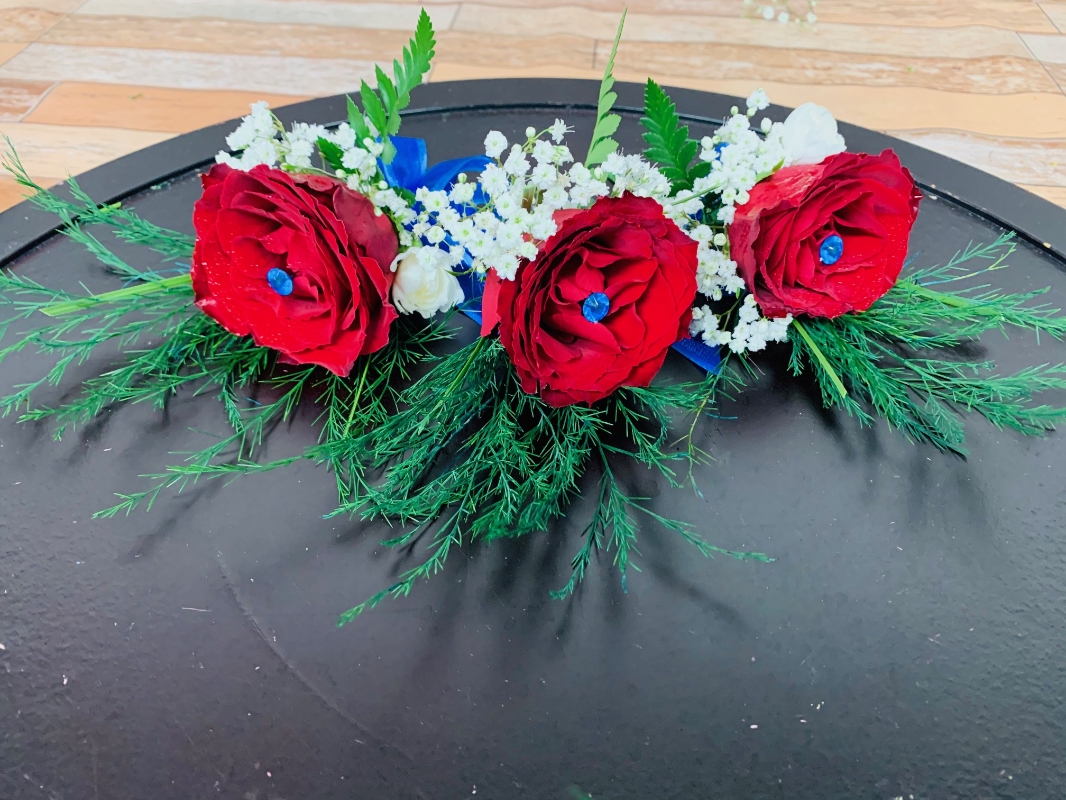 Red roses, surrounded with gypsophelia, lent against seasonal foliage. To complete the theme, tied with thin blue organza ribbon and blue diamonte pins added into the rose centre. White diamonte are also a great option with this theme.