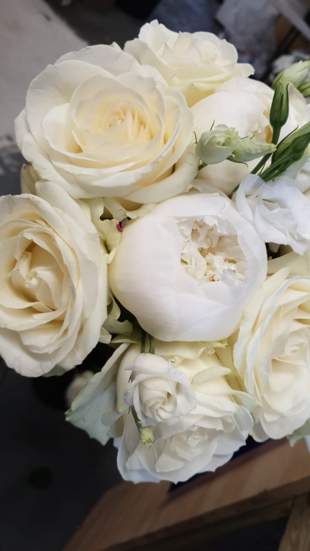 Cream Avalanche roses and peaonies with seasonal filler are used to create this pretty and delicate dome bridal bouquet, then bound in ivory ribbon.