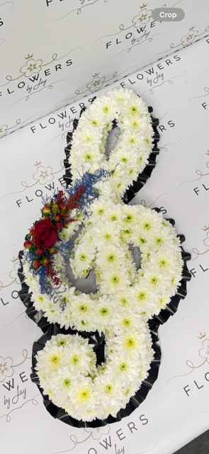 This Treble Clef tribute stands just over 2 ft tall. Based with white chrysanthemums and edged in black ribbon to define the shape of this design.